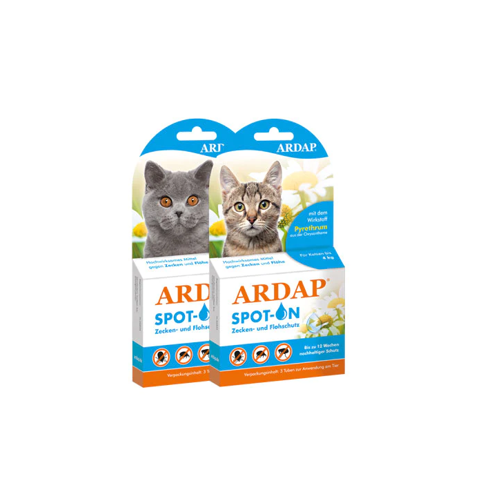 ARDAP Spot-On mit dem Wirkstoff Natur-Pyrethrum aus der Chrysanthemenblüte ist ein hochwirksames Mittel zur äußerlichen Anwendung bei Katzen. Das Wirkprinzip von Chrysanthemum ist die Abwehr, auch bekannt als repellierende Wirkung gegen Schadinsekten. Durch die repellierende Wirkung bietet ARDAP Spot-On einen zuverlässigen und lang anhaltenden Schutz zur Vorbeugung gegen Zecken- und Flohbefall. Die Verpackung mit 3 ARDAP Spot-On Tuben schützt bis zu 12 Wochen vor dem Wiederbefall mit Zecken und Flöhen.