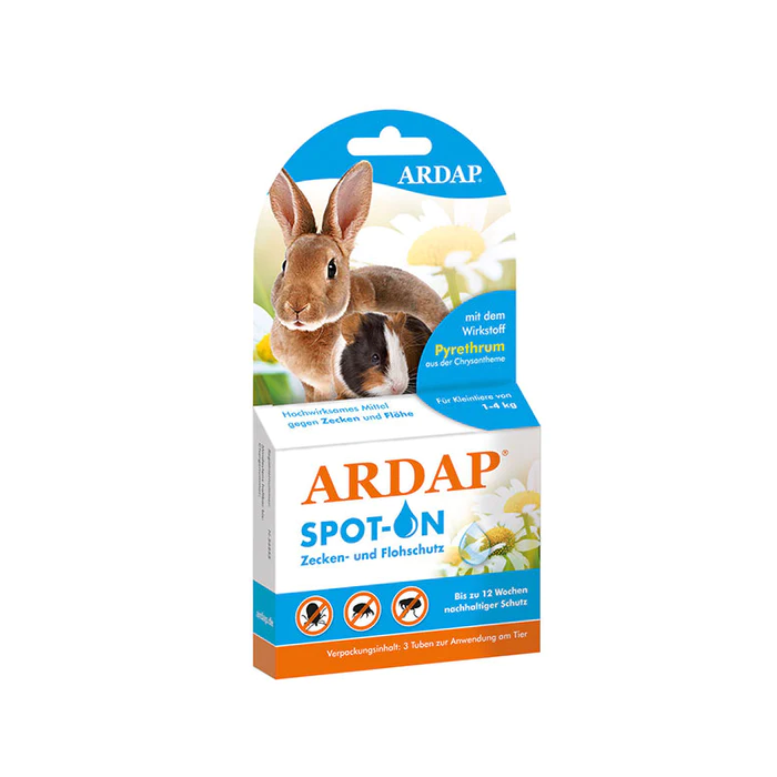 ARDAP Spot-On mit dem Wirkstoff Pyrethrum, auch Chrysanthemum genannt, aus der Chrysanthemenblüte ist ein hochwirksames Mittel zur äußerlichen Anwendung bei Kleintieren und Nagern. Pyrethrum ist bekannt für seine repellierende, d.h. abwehrende und damit vorbeugende Wirkung gegen einen Befall mit Schadinsekten wie Zecken (Rhipicephalus sanguineus, Ixodes ricinus) und Flöhe (Ctenocephalides felis, Ctenocephalides canis). Die Verpackung mit 3 ARDAP Spot-On Tuben schützt Kleintiere und Nager zuverlässig und langanhaltend bis zu 12 Wochen. Die Behandlung kann wiederholt werden, falls das zuvor behandelte Kleintier mehrfach in heftigen Regen oder ins Wasser geraten ist.